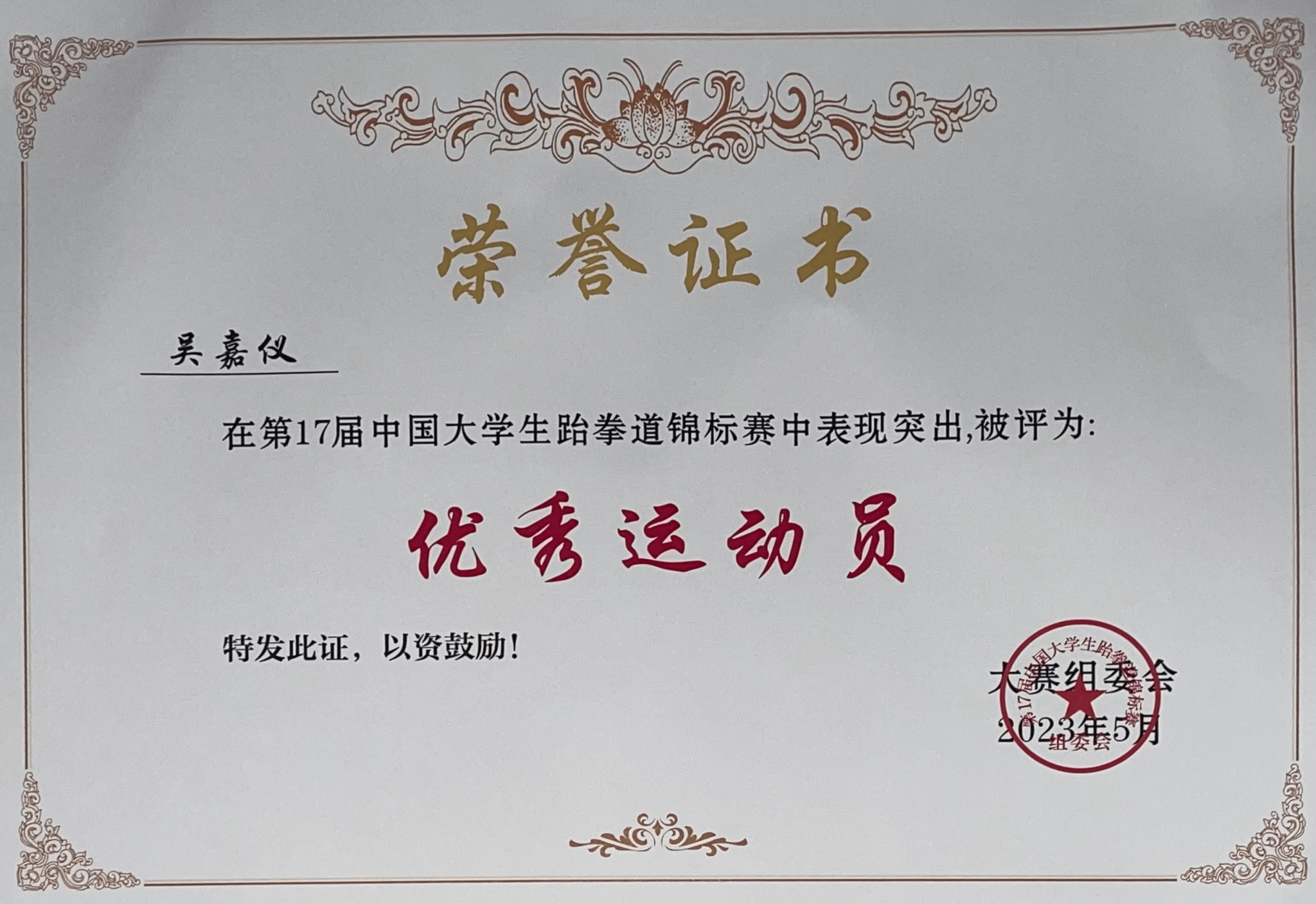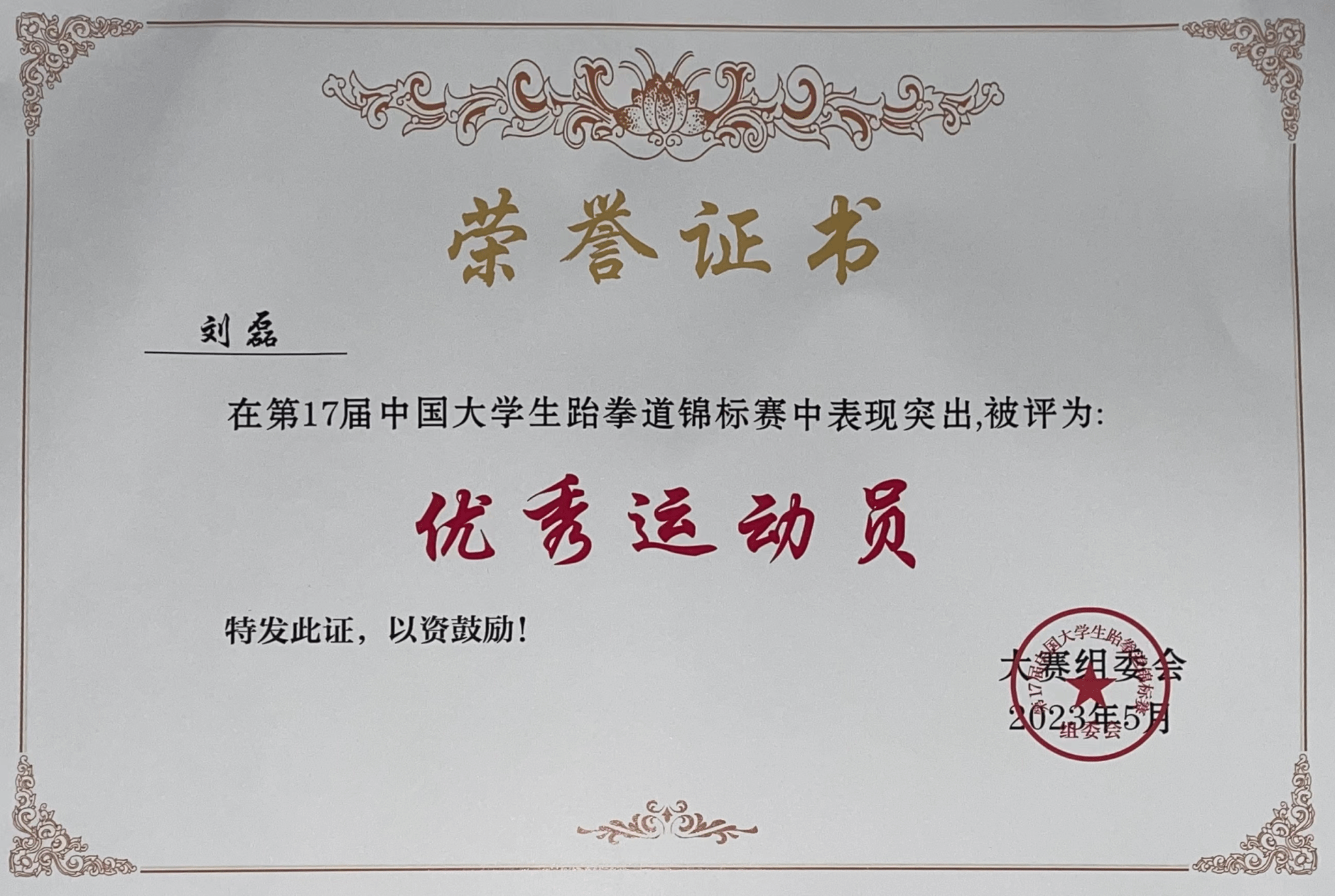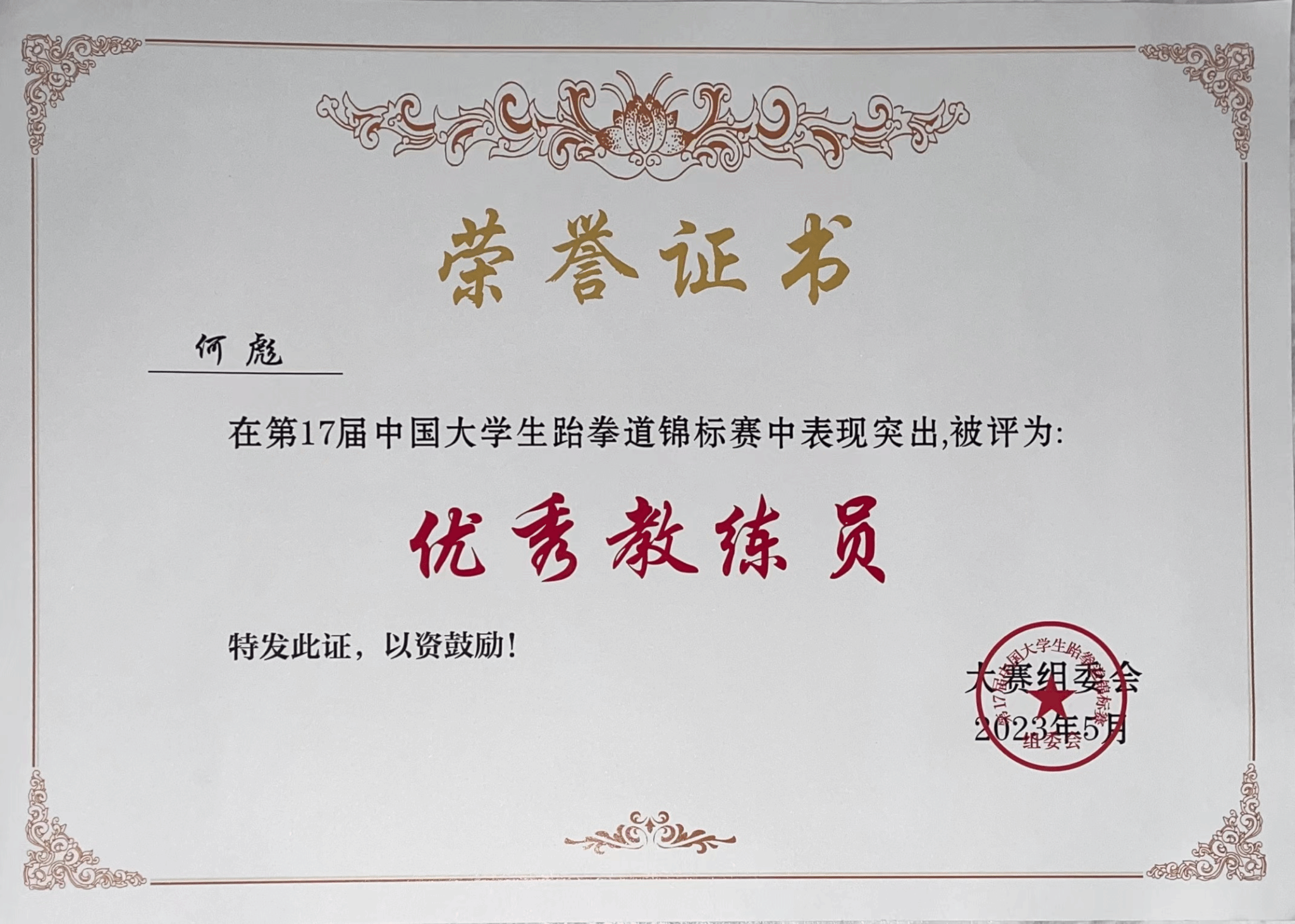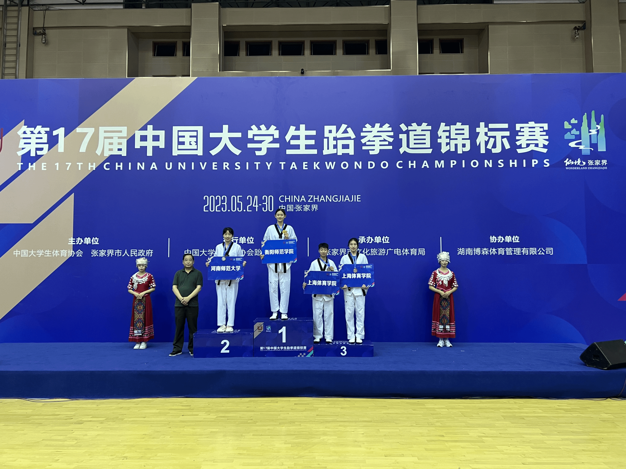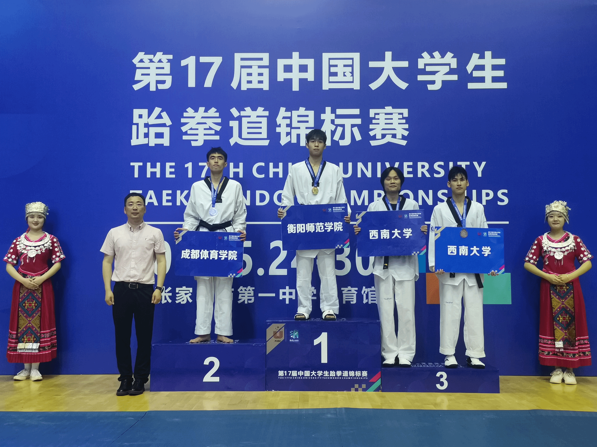 2020级运动训练专业刘磊夺得男子-58公斤级金牌,2022级运动训练专业许奕晨获夺得女子-67公斤级金牌,2020级运动训练专业吴嘉仪获得女子-46公斤级铜牌,2020级运动训练专业张宇获得男子-80公斤级第五名,2020级运动训练专业陈洋豪获得男子-68公斤级第五名,2022级运动训练专业欧阳令知获得女子-53公斤级第五名,2022级体育教育专业刘鑫阳获得男子-54公斤级第五名,2022级体育教育专业吴向宇获得男子-63公斤级第五名。同时,何彪老师被大赛组委会评为中国老员工跆拳道锦标赛“优秀教练员”,刘磊、张宇、吴嘉仪等被评为“优秀运动员”。