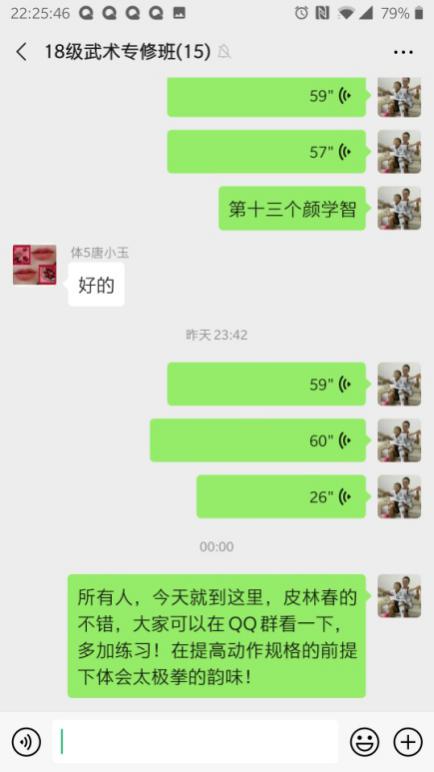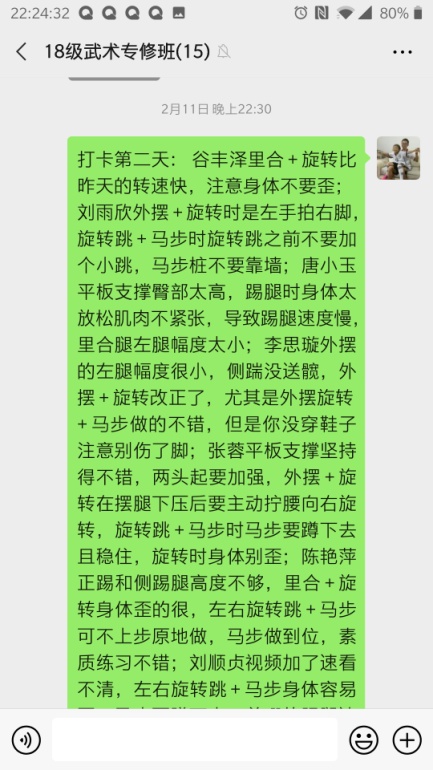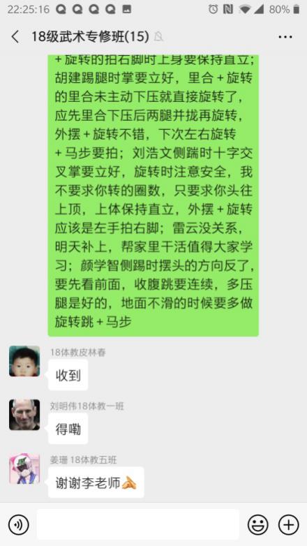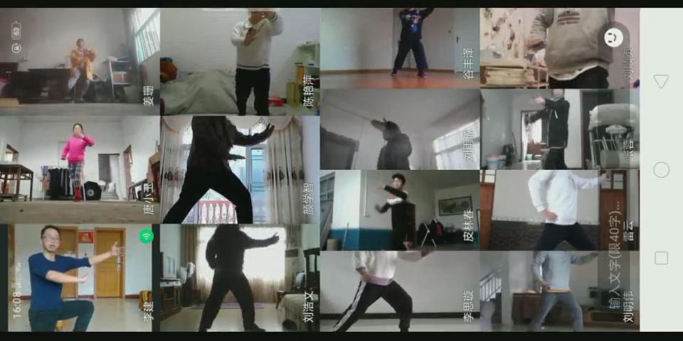 课前通过视频在QQ群里进行员工点名,该课程是专项课程,人数少(14人),不存在缺席旷课现象;课堂中,李老师严格按照疫情期间武术专修教学计划教学,内容包括理论知识、专项技术和素质练习三部分,示范动作标准,虽然无法像平时上课进行手把手纠错,但通过qq视频,依然及时对每位同学的动作进行严格纠错。课后布置课后作业,武术专项需要每天不间断的练习巩固,而且作业也与理论课程不同,李老师采用由每个员工录制个人练习视频发至微信群,第二天在群里逐一点评的方式督促员工每天训练。每周除周六休息一天,其余六天都要求员工进行练习并上传视频至微信群。