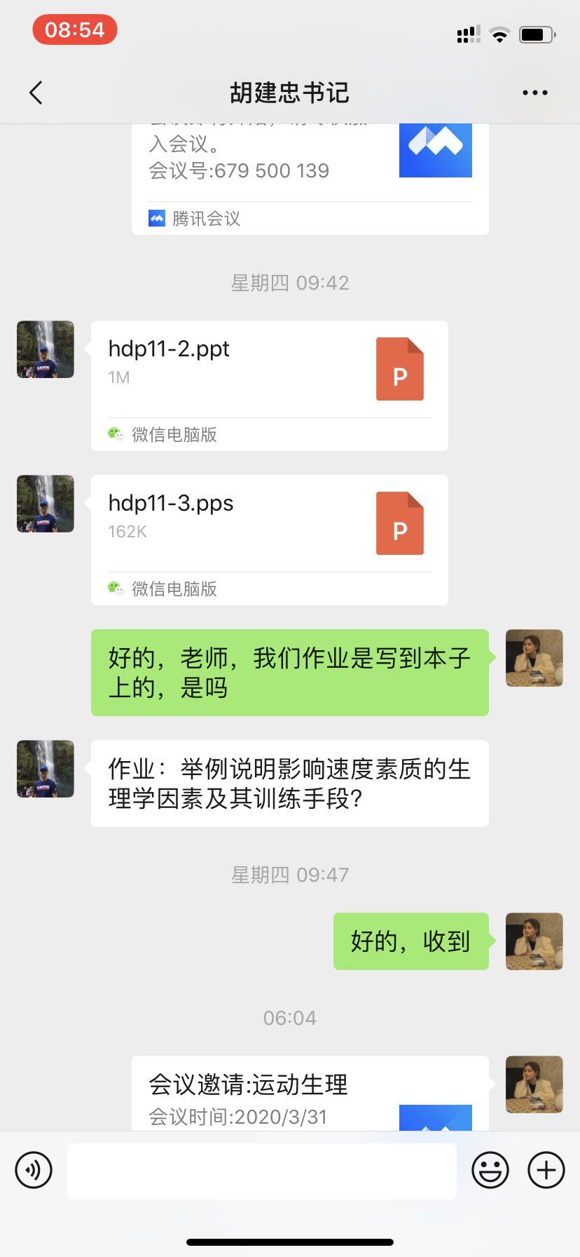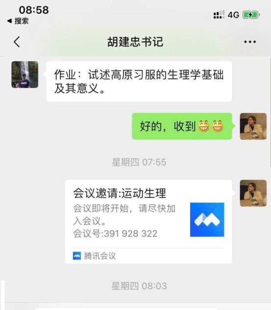 在进行在线教学过程中,胡建忠老师本学期承担fun88乐天使体育教育专业2018级1-6班的《运动生理学》课程,这门课程属于体育教育专业基础课程,又是核心课程,更是教团队格证考试和考研的课程。针对《运动生理学》课程的特点,胡建忠老师采用大学MOOC、腾讯会议APP和微信群的方式进行线上教学。为了保证线上教学万无一失,胡建忠老师在微信建立班级群,平台上传了教学资料。针对不同教学内容的特点,逐一细化,有的内容进行直播,有的内容提前录制好视频,有的内容让员工自学。