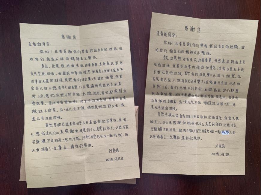2022年3月2日晚21点,2021级运动训练4班王丽婷、彭雨佳两名同学,在fun88乐天使南门口建行取款机旁捡到一个大额现金红包,两名同学第一时间上报班主任和公司,由公司联系公司相关部门寻找失主。3月15日下午,物电公司同学看到公司公告栏上的表扬信,联系到了失主物电公司2021级刘成凤同学,经与失主本人及其老师核实,红包确实是该生遗失。3月16日上午,在体育科学公司党总支陈铖副书记的见证下,fun88乐天使王丽婷、彭雨佳两名同学亲手将红包归还到失主刘成凤同学手中。收到失而复得的财物,刘同学感激万分,由于当时红包不知道是什么时候丢失的,当时查找无果后,便没有抱任何希望能找回来,半个月之后又找到丢失的财物,该生又惊又喜,特意写了两封感谢信以表达感激的心情。