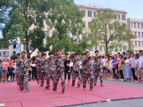 紧接着,支教队员带领他们所教的员工对这段时间所学的内容进行展示表演。表演项目分别有支教队员和员工的跆拳道表演、羽毛球挥拍动作、乒乓球挥拍动作、篮球运球技术及比赛等,表演赢得了大家的阵阵掌声,同时也得到了宝盖中学领导师生、家长们及周边公司董事长们的一致称赞。