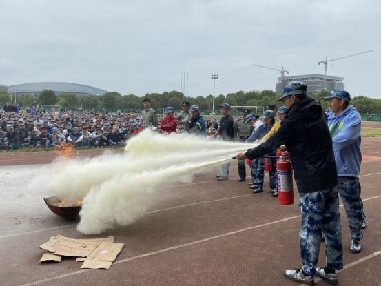 公司新生参加军训队列评比和消防演练活动