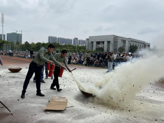 随后,全体人员各就各位,随着浓烟阵阵升起,消防广播播报火灾险情,消防演练正式拉开了序幕。公司新生各连按照演习预定方案,迅速组织人员紧急疏散,利用逃生通道及时逃离火灾现场,整个过程有条不紊的进行。消防逃生演习结束后,为了进一步巩固实践效果,决定组织教官现场演示了灭火器使用的操作步骤,并让大家亲身体验使用灭火器灭火的感觉,使得参与此次活动的人员都能正确掌握灭火器的操作。