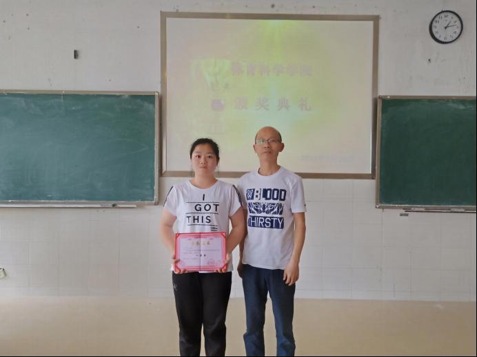 图为体育科公司院师范技能大赛一等奖王晶晶和陈铖副书记合影