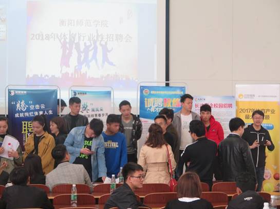 招聘会由陈铖副书记主持。这次招聘大会,一共邀请了16家用人单位参会,其中有校级就业基地——珠海正能量公司,体育行业优秀企业:长沙体育产业经营有限公司、长沙翼腾体育文化发展有限公司、上海动因体育文化公司等,还有公司2017届毕业生蔡康、王鑫、彭鑫等自主创业创办的公司,以及衡阳本地知名企业。招聘会先由各用人单位代表用3分钟时间进行宣讲,介绍了自己单位的特色优势、用人需求和聘任待遇等,并发下相关资料,让同学们仔细了解。宣讲后,进入面对面招聘环节,由毕业生和用人单位开展面对面沟通、交流、咨询或面试。毕业生们向自己中意的单位递交了简历等求职材料。