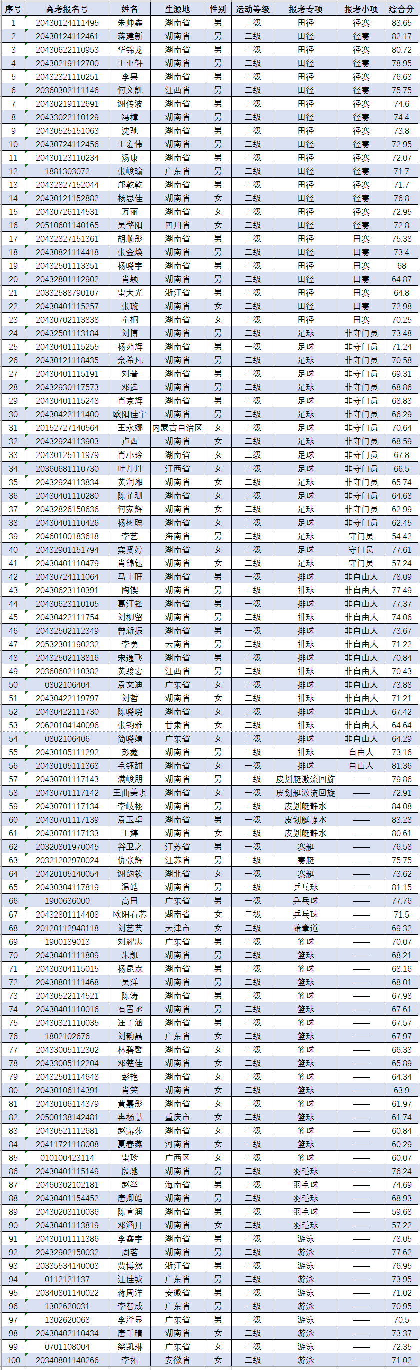 根据国家体育总局科教司和教育部高校员工司联合下发的《2020年普通高等公司运动训练、武术与民族传统体育专业招生管理办法》(体科字[2019]155号)、国家体育总局司局《2020年普通高等公司运动训练、武术与民族传统体育专业招生管理办法操作细则》(体科字[2019]134号)、《2020年运动训练专业招生简章》等文件精神,结合公司人才培养要求和体育团队建设与竞赛需求,按照公平公正公开、择优录取原则,公司确定了2020年运动训练专业拟录取名单,现予以公示。